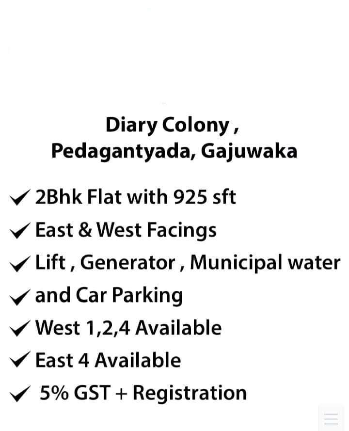 ๐ŸŽ‰๐ŸŽ‰๐ŸŽ‰OFFER OFFER OFFER ๐ŸŽ‰๐ŸŽ‰๐ŸŽ‰๐ŸŽ‰๐ŸŽ‰ ๐Ÿ‘‰The Brand New Flats in Pedagantyada, Gajuwaka HB Colony Project Gayathri Nivas ... Very Prime location Area ๐Ÿ‘‰ 2bhk 925 Sft Flat ๐Ÿ‘‰ East & West Facings ๐Ÿ‘‰๐ŸปAvailable only 3flats ๐Ÿ‘‰ Lift , Generator , Municipal water and Car Parking... Today Company special Endless offer is Very Low Price : 33lakhs with Luxurious Interiors ..๐Ÿ  ๐ŸŽ‰๐ŸŽ‰ This Offer Only First 2members Hurry up Grab Offer ๐ŸŽ‰๐ŸŽ‰ ๐Ÿฆ 90%loan approval ๐Ÿฆ Very Low Investment Price Under construction