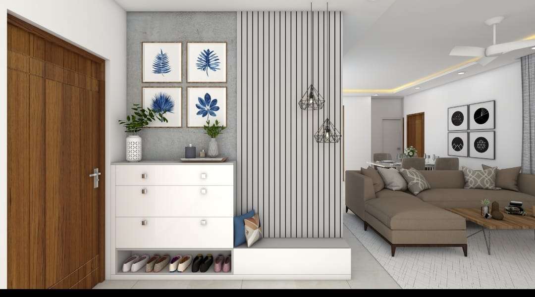 * Modern customised shoe rack in foyer with decorative platform.