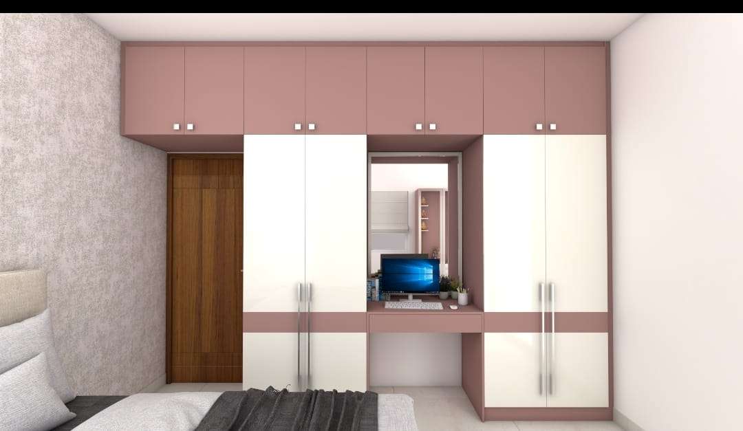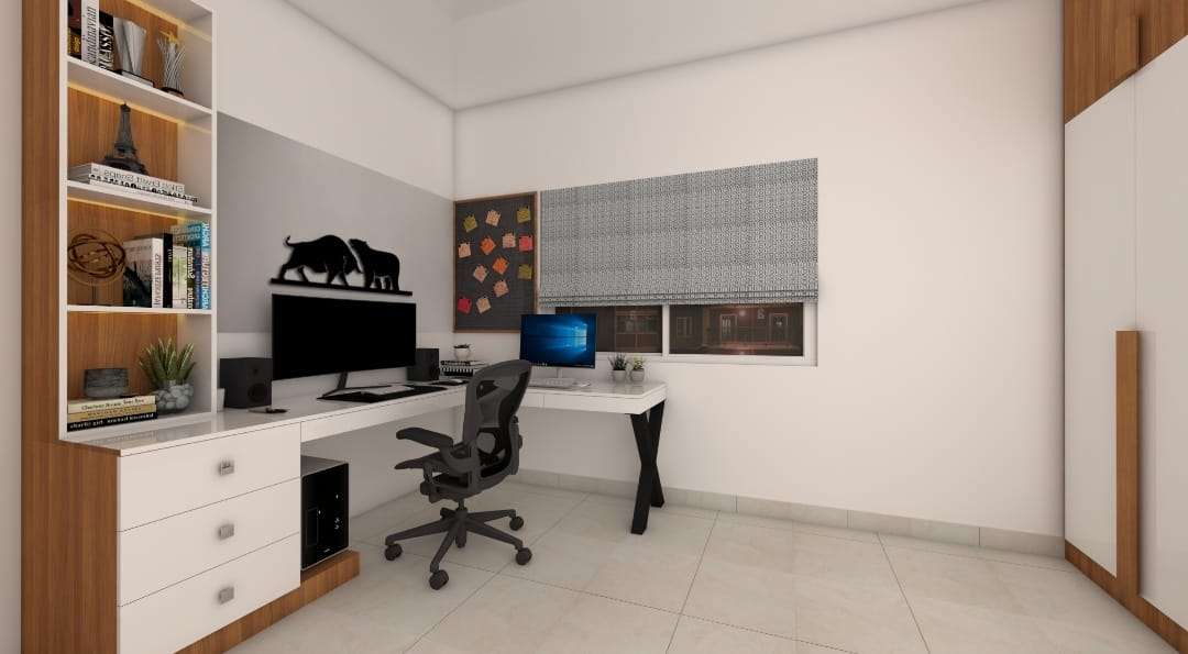 * Modern L shaped study cum office unit with tall book shelf, additional Drawer unit and lighting, white board and pin board mounted on the wall.