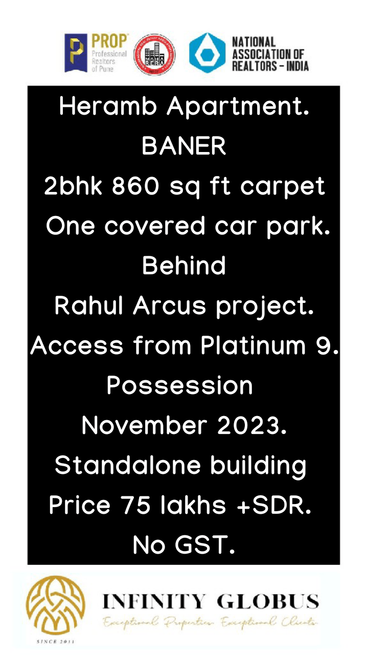 Property for Sale at Baner. Behind Rahul Arcus project. Heramb Apartment 2bhk 860 square feet carpet with one covered car park. Possession Nov23. Standalone building Price 75 lakhs. SDR Extra. No GST. #NoBrokerage. 8888861808