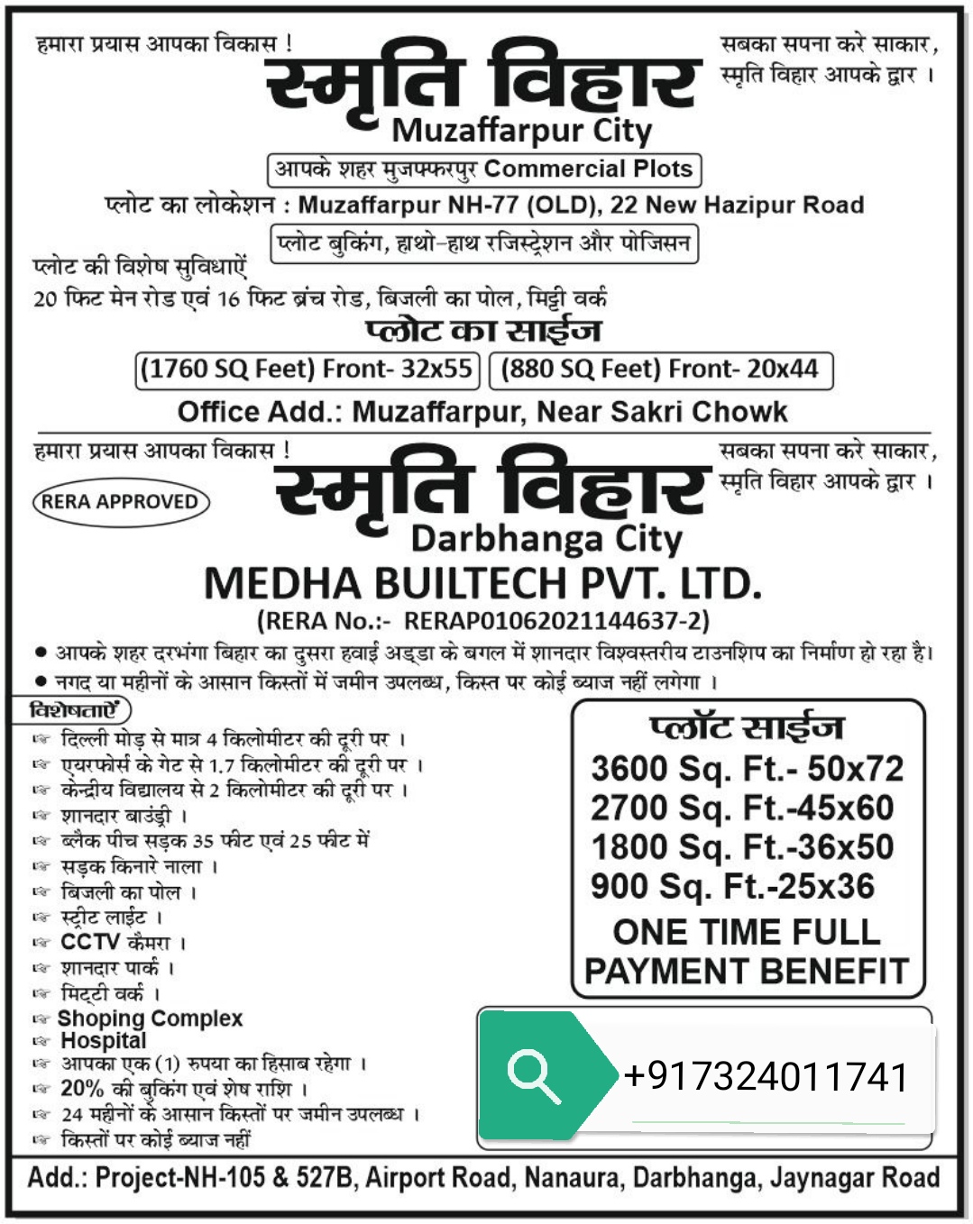 दरभंगा हवाई अड्डे के पास हमारे स्मृति विहार टाउनशिप प्रोजेक्ट में प्लॉट की प्रत्येक बुकिंग पर ग्राहकों को निश्चित उपहार मिलेगा।